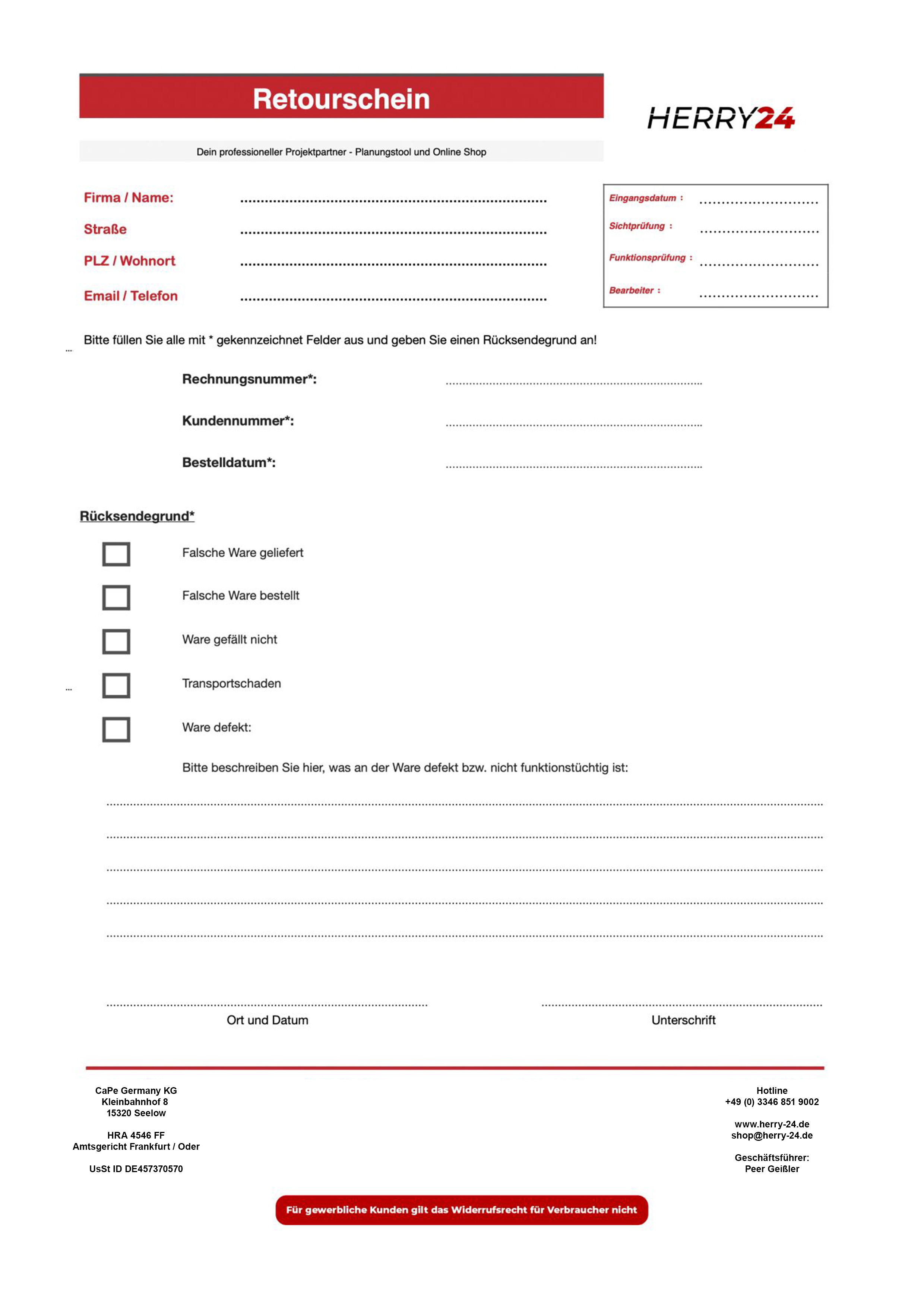 Für Ihre Warenrücksendungen an uns benutzen Sie bitte einen Retourschein. Diesen finden Sie hier unterhalb des Textes und auch hier zum Download. Den Retourschein füllen Sie bitte unbedingt vollständig aus und legen diesen der Rücksendung bei.